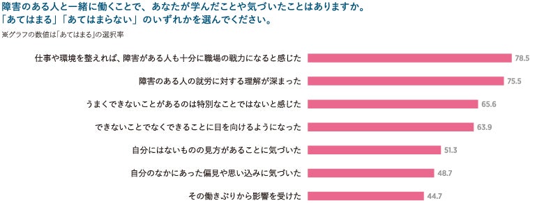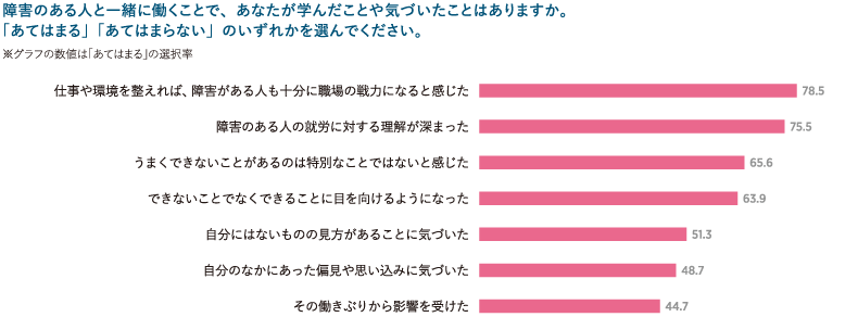 ⇒一緒に働く経験が、障害者の就労や活躍に対する理解を大きく促進することがわかる。