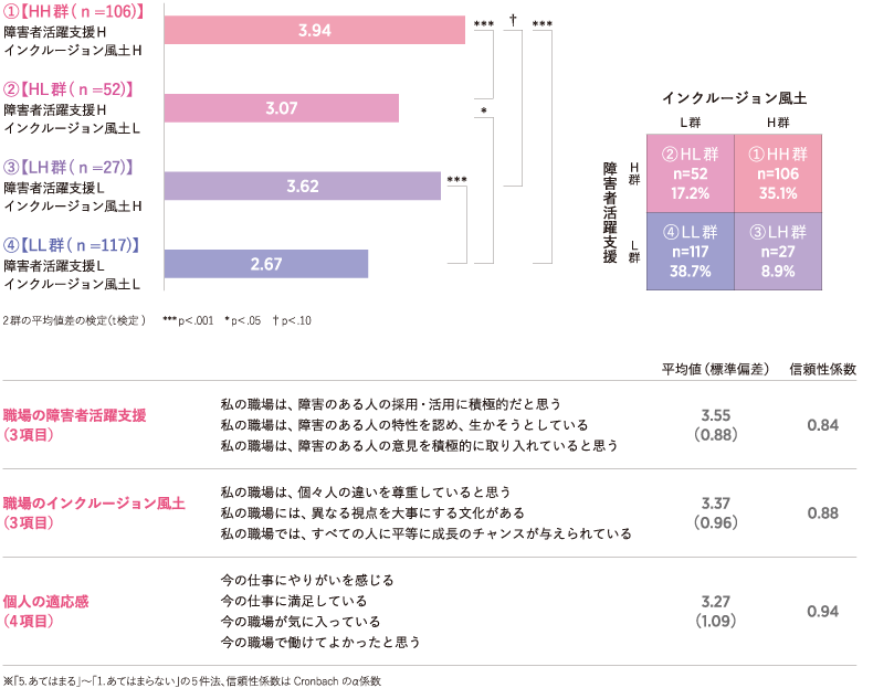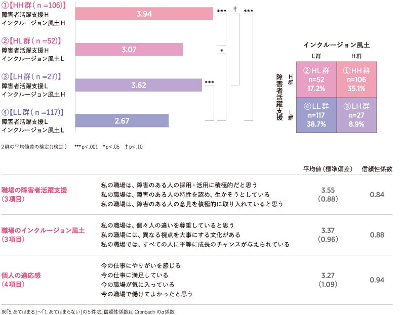 ・一方、障害者活躍支援は進んでいるが、インクルージョン風土は低いと感じているHL群(②)は、HH群(①)と比べて、適応感が有意に低い。