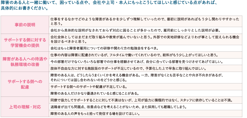 ・障害者支援の拡充に関するものについては、「事前の説明」について、「仕事をするなかでどのような障害があるかを少しずつ理解していったので、最初に説明があればもう少し関わりやすかったと思う」「会社から具体的な説明がなされておらず対応に困ることが多かったので、雇用前にしっかりとした説明が必要」といったコメントが見られた。