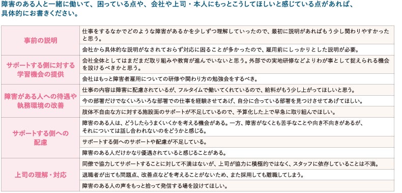 ・ 障害のある人と一緒に働いて、困っている点や要望したい点について、自由記述で回答を得たものを抜粋した。大きく分けて、障害者支援の拡充に関するものと、サポートする側への配慮や要望に関するものが見られた。
