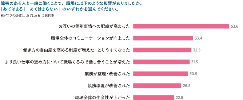 ・障害のある人と一緒に働くことで、どのような影響があったかについて、最も多かったのは「お互いの個別事情への配慮が高まった(53.6%)」だった。