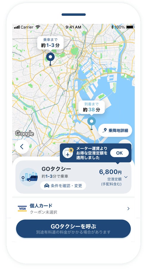従来のタクシーの空港定額運賃サービスは、空港に向かう1時間以上前の予約が必須とされていましたが、『GO』では事前予約不要で空港定額運賃の適用が可能です。本機能はiOS版から提供を開始し、8月上旬にAndroid版を公開予定です。