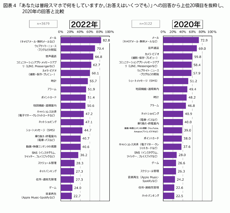 2020年には5位だった「ウェブサイト・ニュース・ブログなどの閲覧」が70.4%で2位になり、2020年に2位だった「音声通話」は66.8%で3位に下がりました。