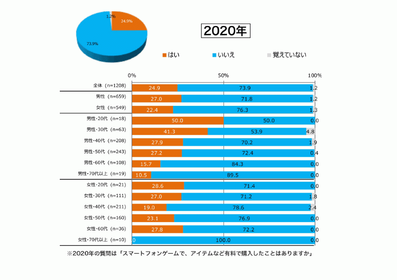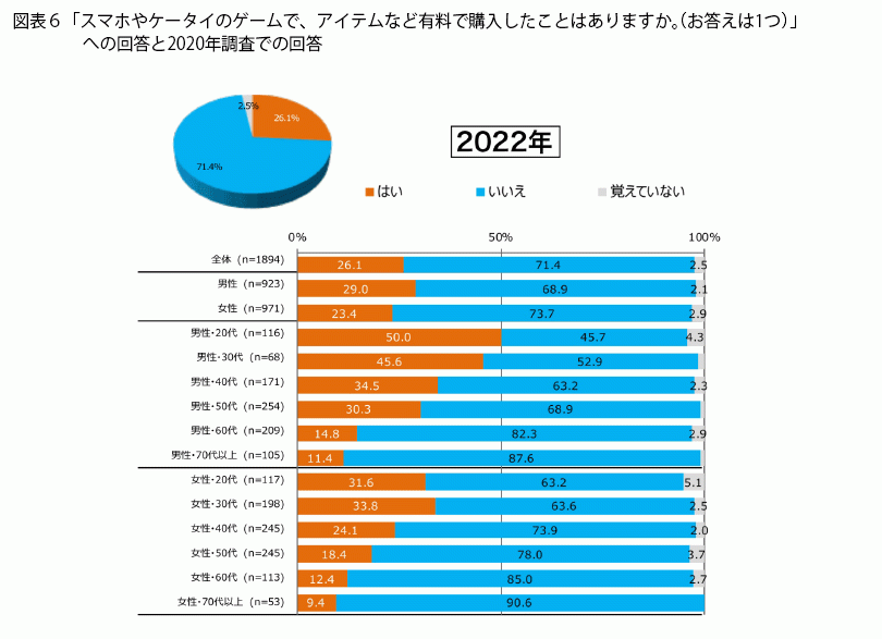 2020年の調査では「スマートフォンゲームで」の購入に限って質問しており、今回はケータイも含めたことが結果に多少の影響は出ているでしょうが、30代、40代は前回調査の時点でスマホを利用していた人がほとんどでしょう。