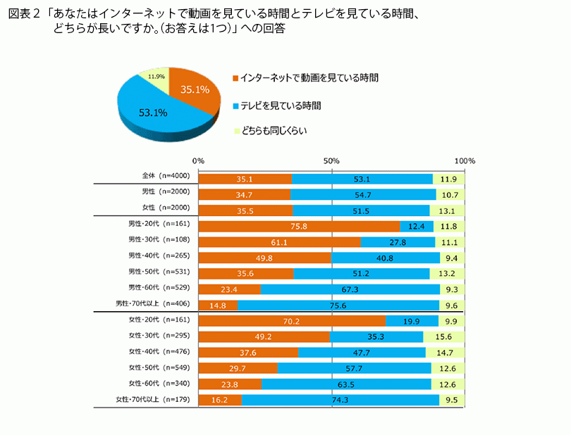 性年代別で見ると、「男性・20代」が72.7%と最も低く、唯一8割を下回っています。「インターネットで動画を見ている時間のほうが長い」と回答した割合が最も高かったのも「男性・20代」ですが、通信量は大丈夫なのでしょうか。