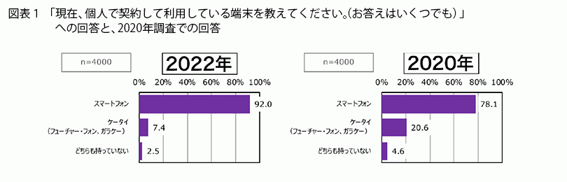 まず、「あなたはスマートフォン(以下、スマホ)、またはケータイ(フューチャー・フォン、ガラケー)を持っていますか。現在、個人で契約して利用している端末を教えてください」と尋ねたところ(図表1左)、スマホを利用していると回答した人は92.0%でした。(契約して利用している端末について尋ねているので、合計は100%を超えています。)