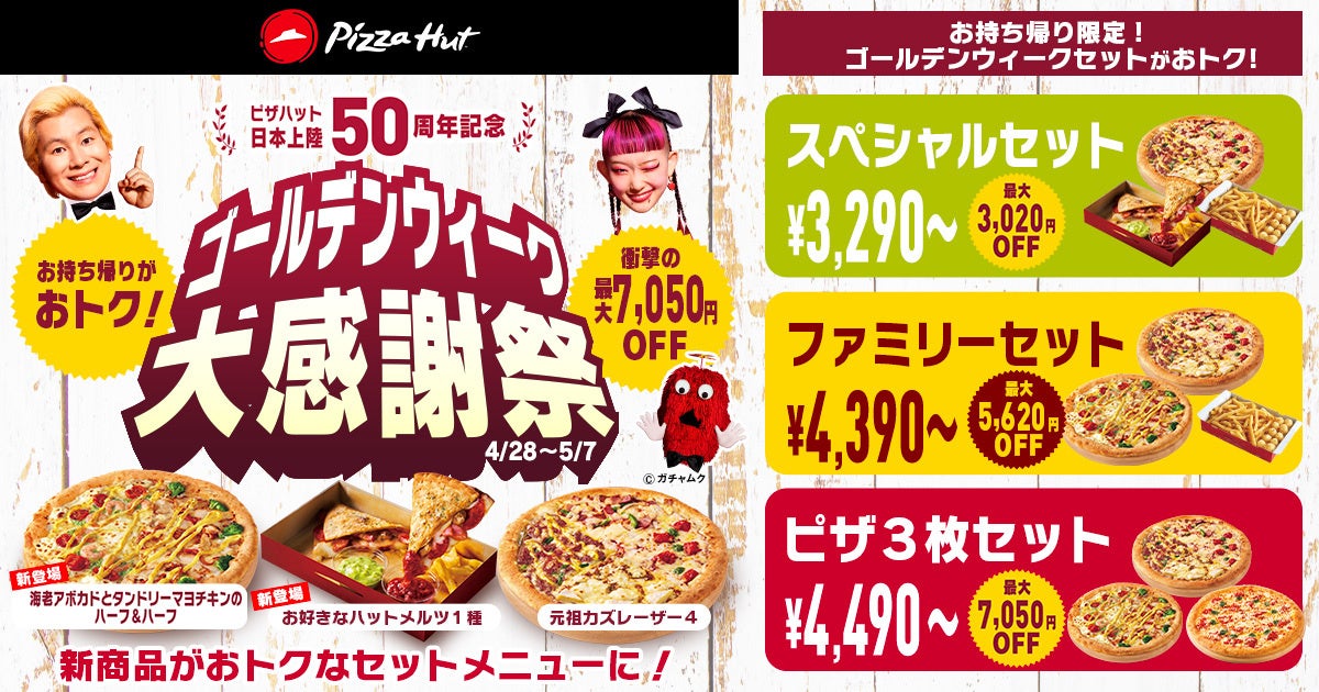 ピザハット日本上陸50周年の特別な「ゴールデンウィーク大感謝祭」を4/28〜5/7で開催!【衝撃の最大7,050円OFF】