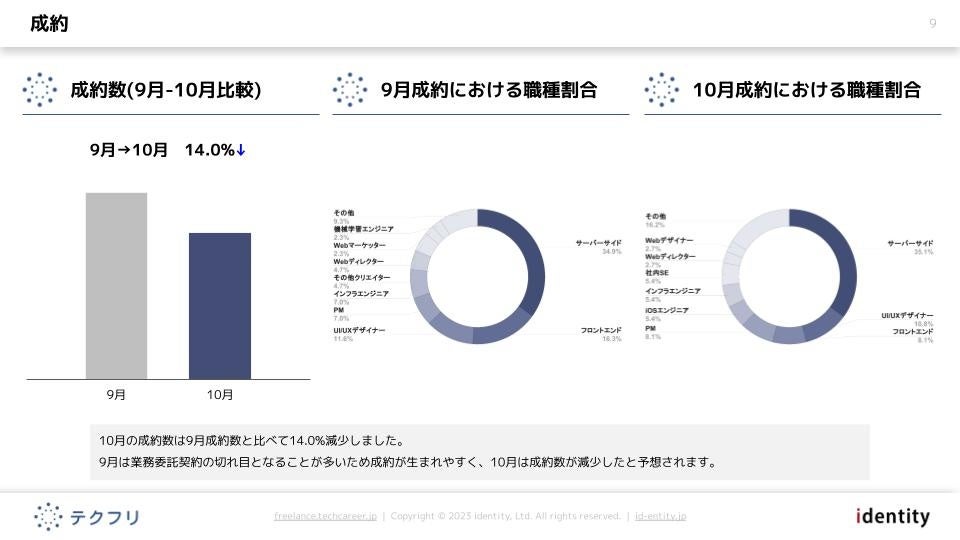 ・[成約]10月の成約数は9月成約数と比べて14.0%減少しました。9月は業務委託契約の切れ目となることが多いため成約が生まれやすく、10月は成約数が減少したと予想されます。