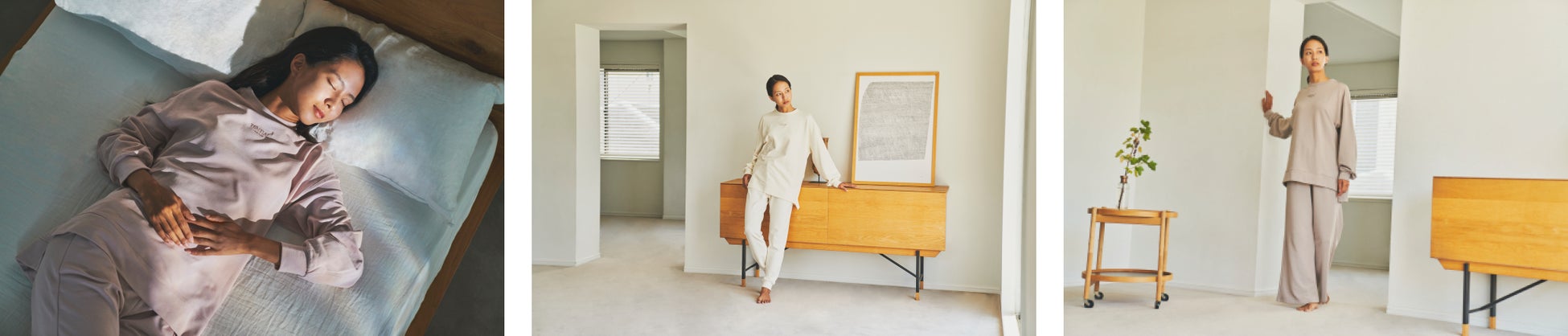 今回スウェットタイプの「BAKUNE Ladies」を発売します。本製品は、トップスは長袖、ボトムスはジョガーパンツ・フレアパンツの2種類を展開、カラーはブラウン・オフホワイト・スモークピンク・ライトグリーンの4色(※1)からお選びいただけます。前回好評だった女性の体格にあったサイズ感と、保温性のある裏毛スウェットパジャマによって、気温が下がるこれからの季節に合ったウェアになっております。また、質の良い睡眠に必要とされる「寝返り」を妨げないために、肩や腕回りの構造にもこだわりました。シアバター加工を施し、しっとりとした肌触りで心地よい暖かさが身体を包み込む、心地良い睡眠体験をお楽しみください。