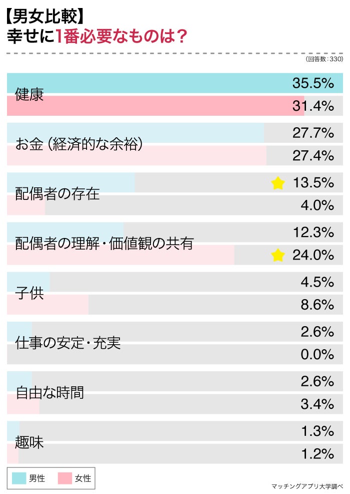 また「子供」に関しては、男性が5位で4.5%、女性は4位で8.6%と、占める割合は低いものの男女で約2倍の差がありました。男性が「子供」よりも「配偶者の存在」を必要と考える人が約3倍多いことは、「配偶者の存在」よりも「子供」を必要とする割合が2倍多い女性との、大きな違いといえるかもしれません。