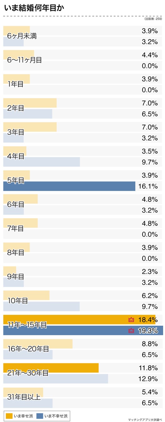 【いま不幸せ派】の場合は、一番多かったのが「11年〜15年目」で19.3%、続いて「5年目」の16.1%、「21年〜30年目」で12.9%でした。結婚期間が10年未満だった人は45.1%、10年以上の人は54.