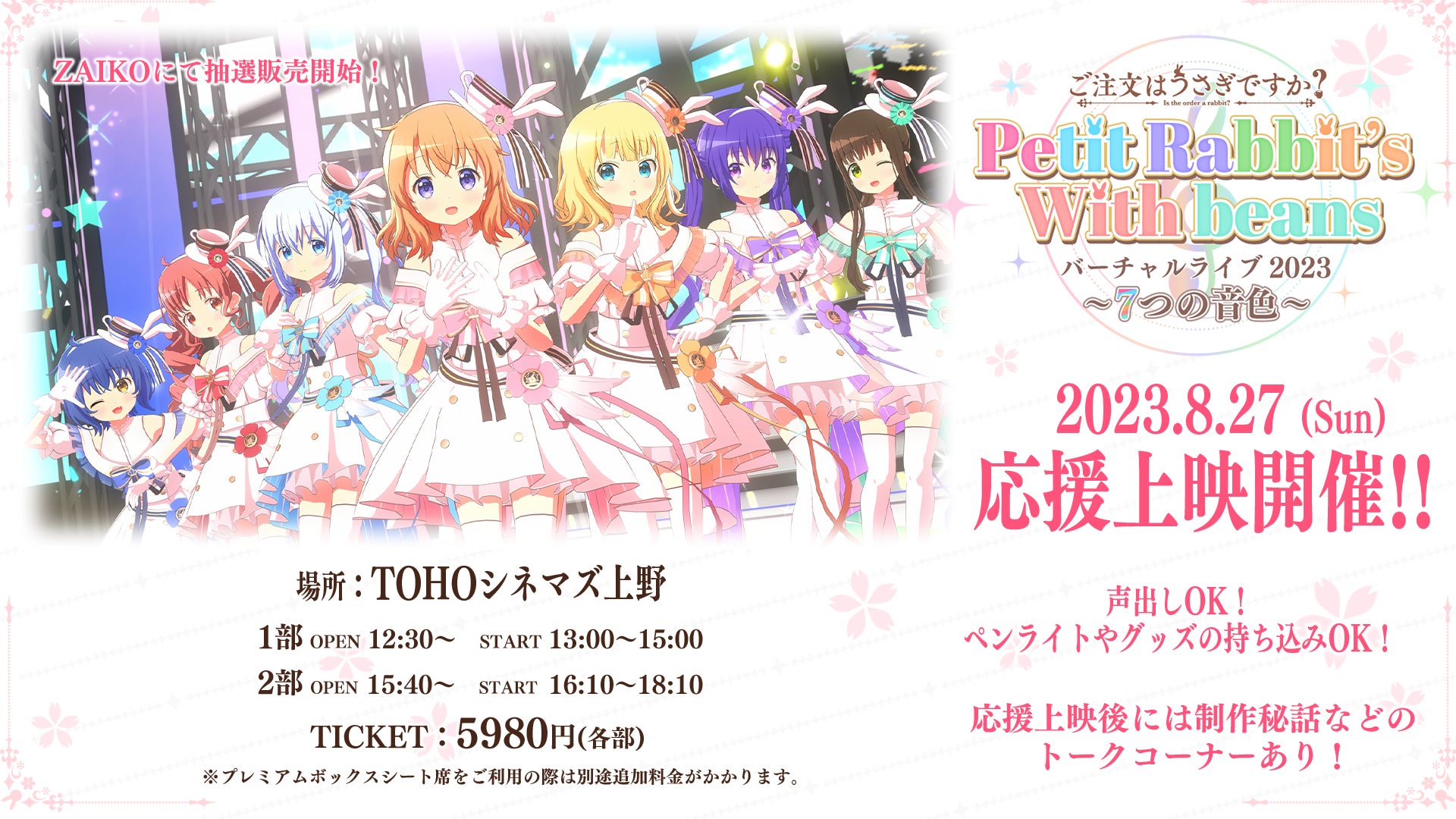 7月29日(土)にZAIKOにて配信された『ご注文はうさぎですか?Petit Rabbit's with beans バーチャルライブ2023 ~7つの音色~』ですが、TOHOシネマズ上野にて応援上映の開催が決定いたしました。