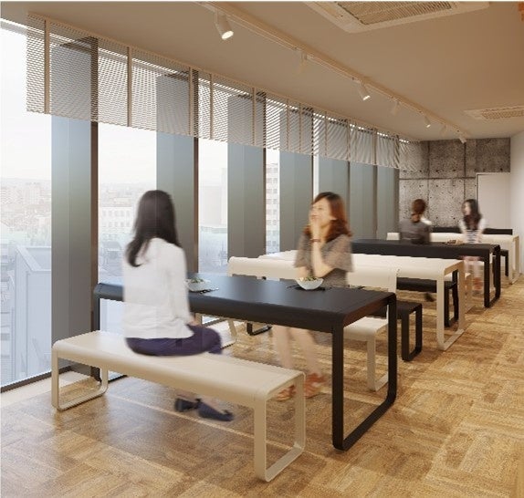 新学生食堂は、空のイメージであるブルーをアクセントカラーとし、内装には木目調や植栽を取り入れ、都会にいながら自然を感じることのできる落ち着いた空間になります。明るく開放感のある食事スペース、まるで屋外にいるようなアウトドアラウンジ、中央に植栽を配置したビッグテーブル、リラックスできるソファラウンジ、一人でも利用しやすいカフェカウンターやカフェブース、充電スポットなど学生が有意義に過ごせる工夫が施されています。
