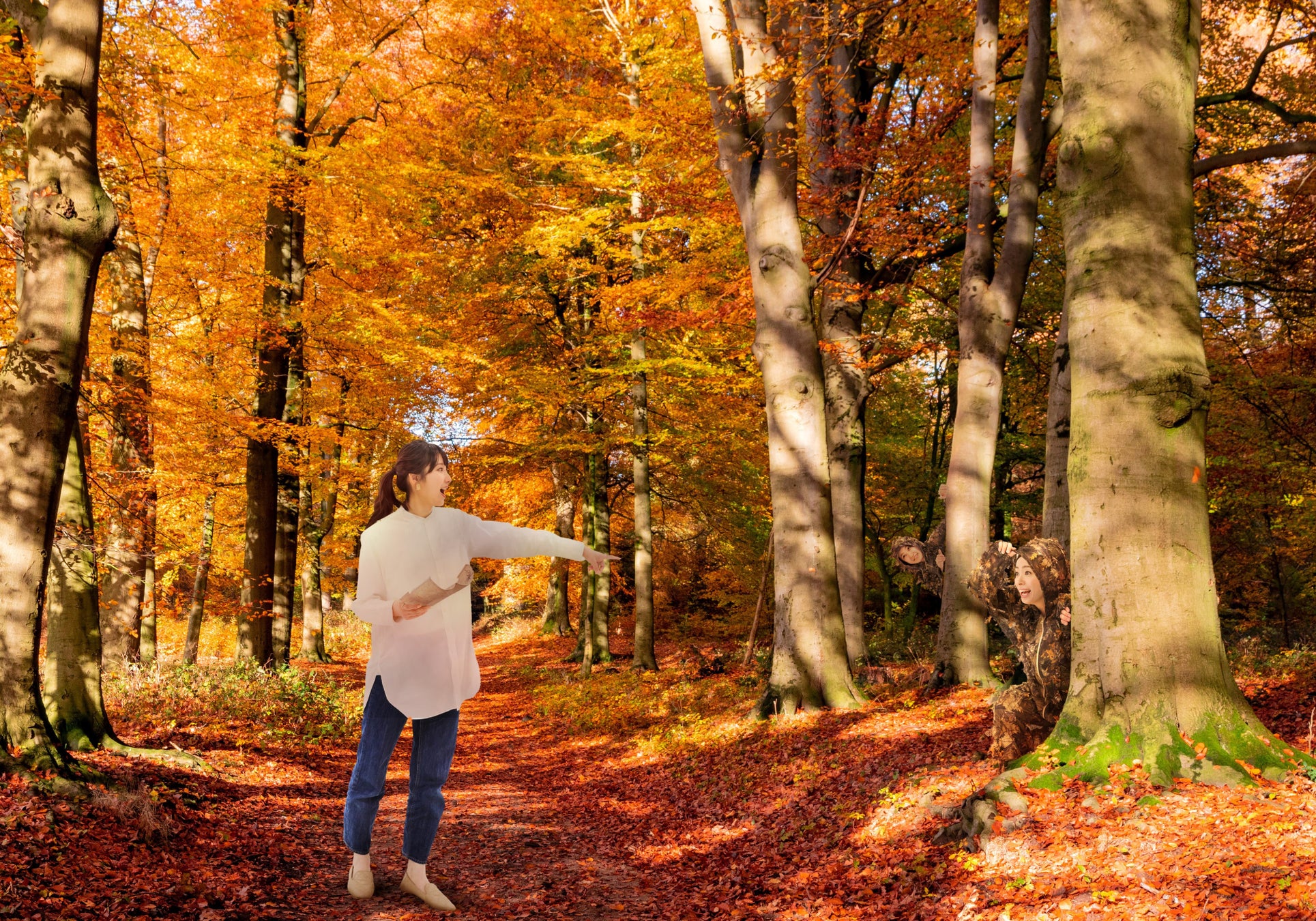 BEB5軽井沢から徒歩10分のところにある森で、かくれんぼができます。紅葉の森の景色と一体化できるもみじ柄のギリースーツ(*)を着ることで、本気で、大人なかくれんぼが楽しめます。紅葉の風景を満喫できるのはもちろん、景色に溶け込むスリル感やおもしろさあり、楽しさもあり!遊びながら、紅葉を満喫できます。