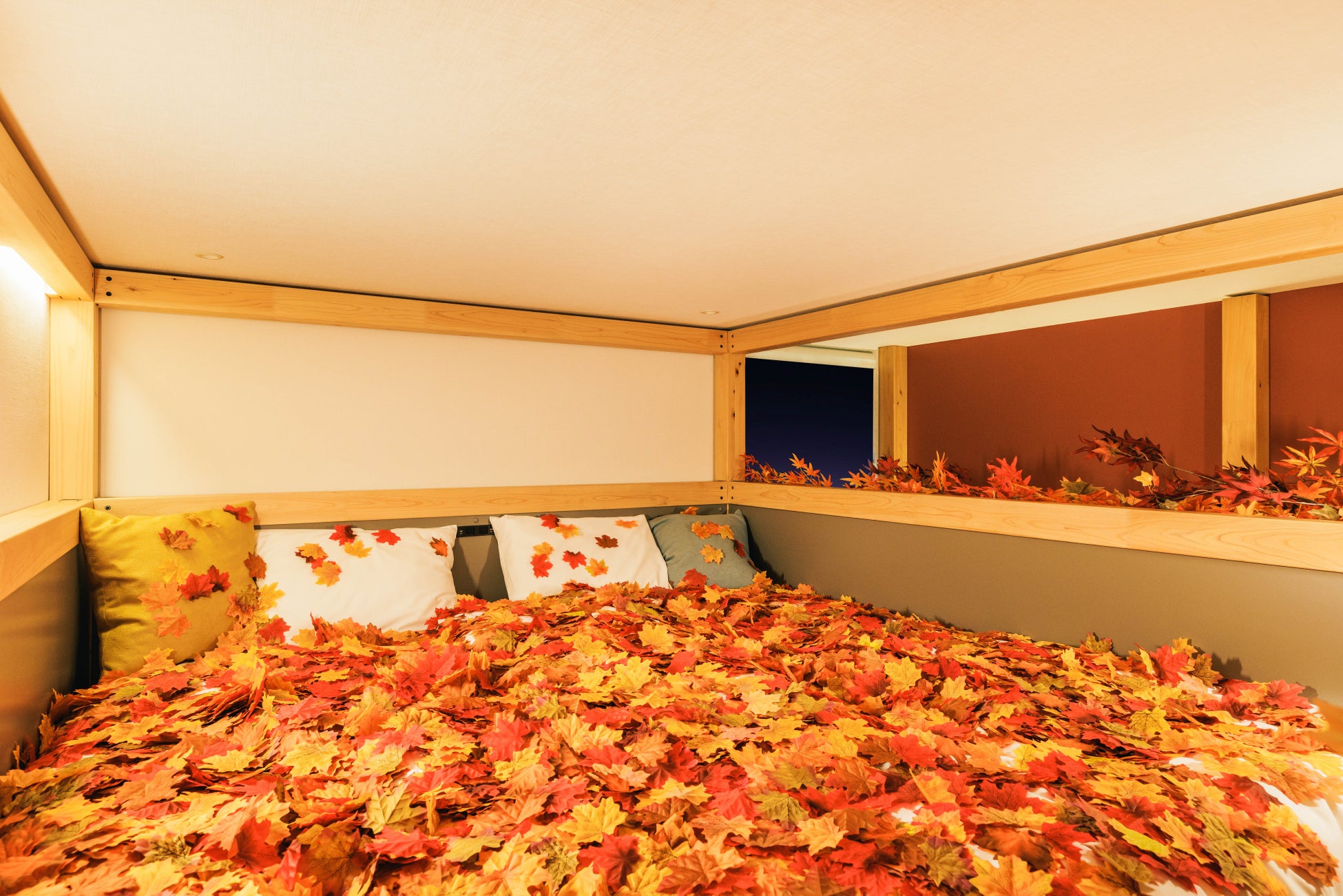 もみじを1万枚以上、ふんだんに設えた紅葉まみれのお部屋を用意します。昨年はソファのみでしたが映える!と、とても人気だったため今年は紅葉の木を設え、ベッドも紅葉で埋め尽くしました。二段構造になっているヤグラ寝台の1階のソファや2階のベッド部分には、まるで色鮮やかな絨毯のようにもみじが広がっており、仲間と思いっきりばらまいて写真や動画を撮るもよし!もみじの上に寝転がって、のんびり夜通しおしゃべりするもよし!室内でも紅葉を存分に楽しむことができます。