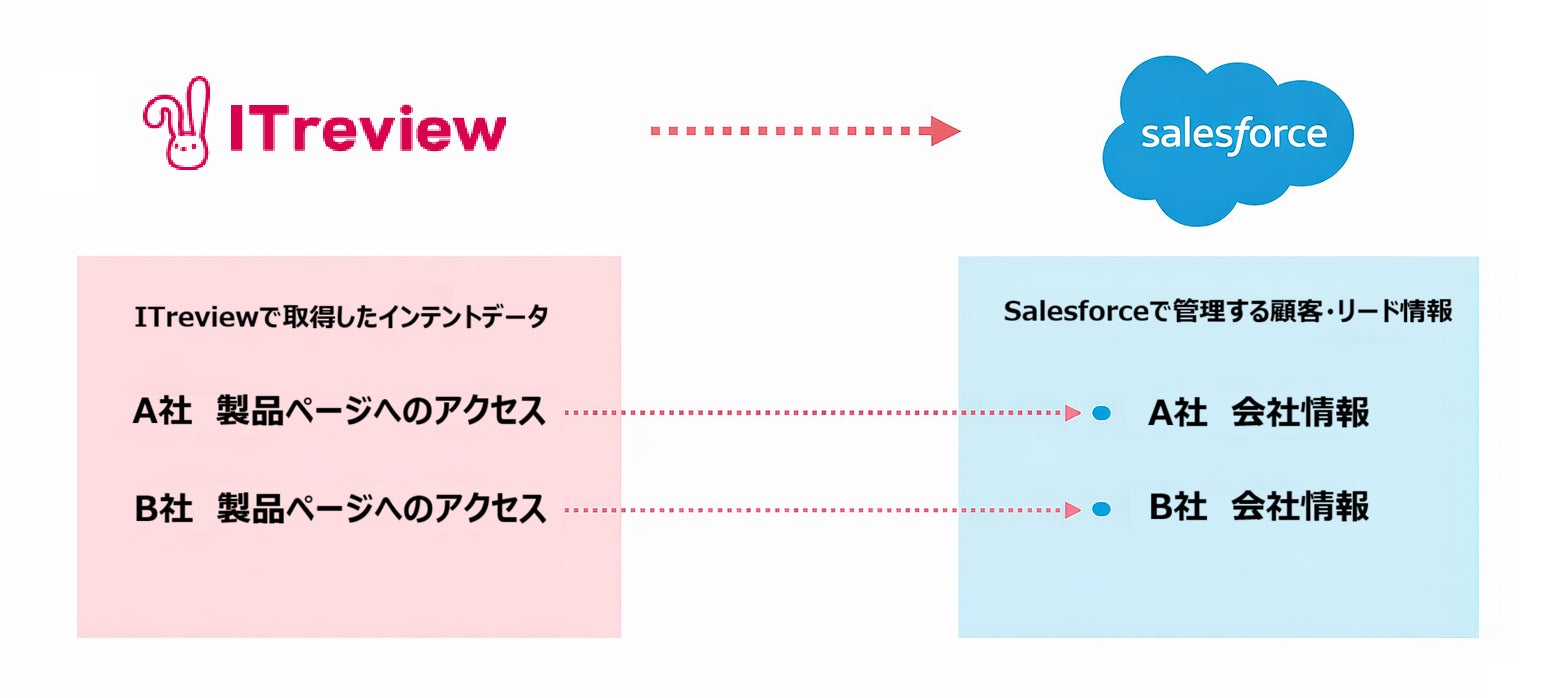 本連携により、ITreviewで取得したインテントデータ(※)をSalesforce上に直接取り込み、企業情報に紐づけて管理することが可能となり、見込み顧客の検討状況を踏まえた、より精度の高いマーケティング・営業活動を実現します。