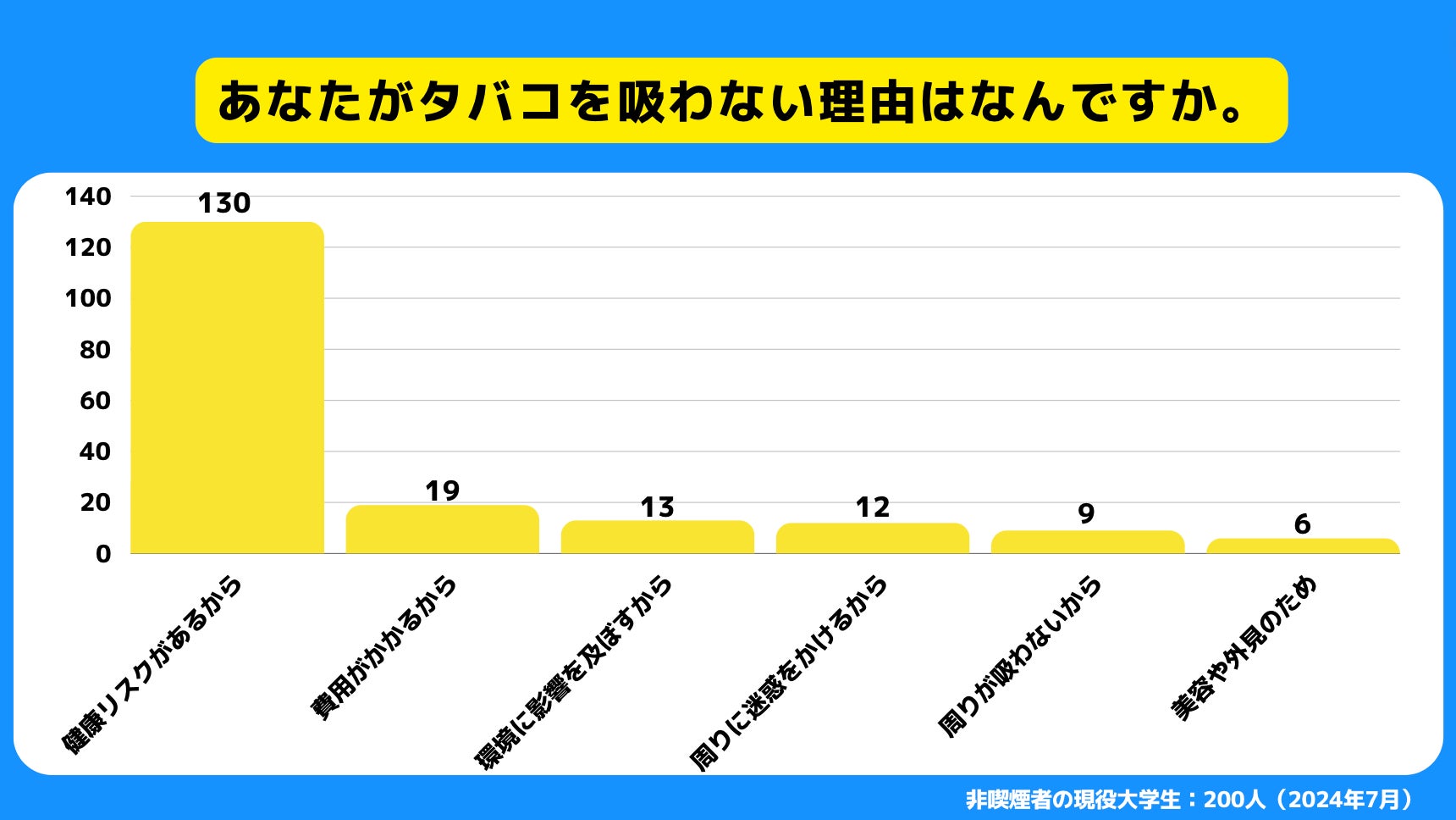 次に、「タバコを吸わない理由」を質問しました。その結果、非喫煙者の大学生のうち130人が”健康リスクがあるから”タバコを吸わないことがわかりました。