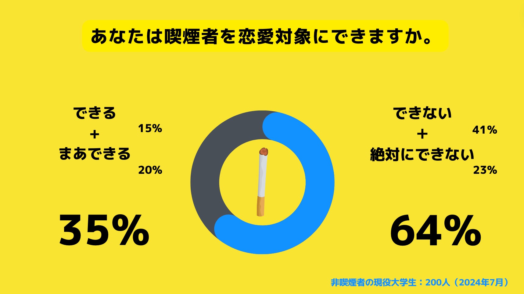 最後に、「喫煙者を恋愛対象にできるか」質問したところ、35%が「できる」、64%が「できない」という結果が得られました。
