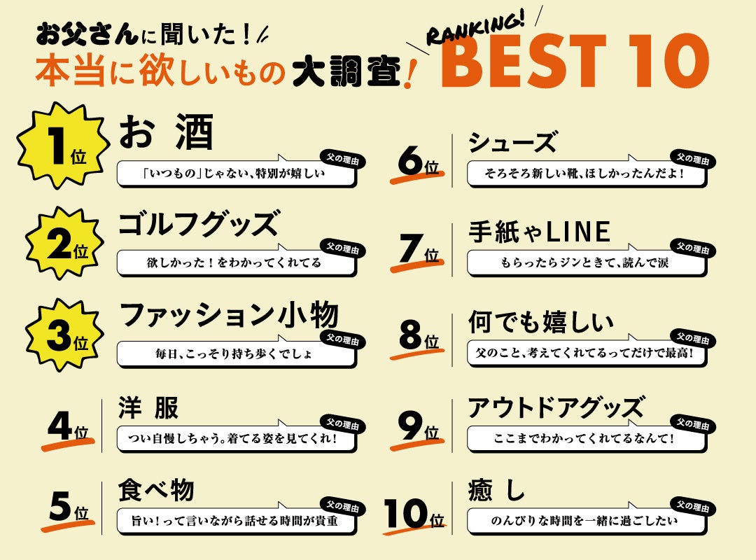 今年こそは主役はお父さん!と調査を決行。お父さん108名に欲しいもの、もらってうれしかったものを大調査!実は、お父さんは家族にもらったお手紙を大切に寝室に飾っているなど、可愛い一面を知ることに!そんなに喜んでくれるのならば、と選ぶ方にも力が入ります。