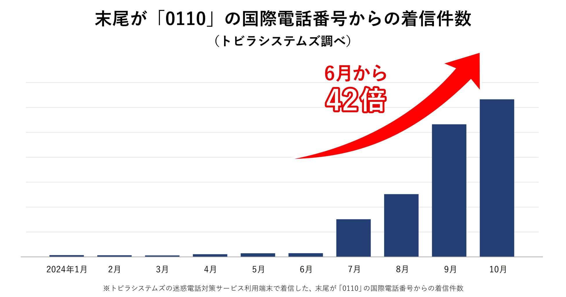 トビラシステムズの調査で、2024年10月に確認された末尾が「0110」の国際電話番号からの着信件数は、増加前の6月から42倍に増加しており、引き続き警戒が必要です。