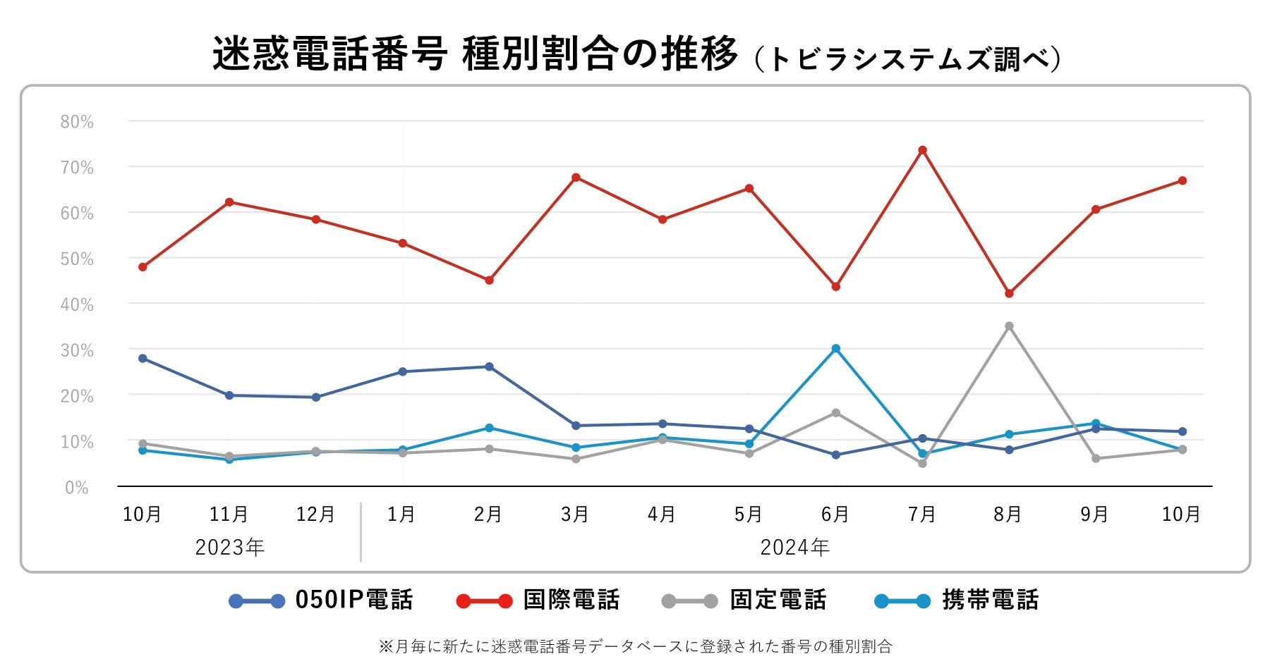 2024年10月に新たにトビラシステムズの迷惑電話番号データベースに登録された番号の種別割合は、国際電話番号が66.9%(前月比+6.3%)で前月から増加しました。特定IP電話番号(050番号)、固定電話番号、携帯電話番号の割合は前月から横ばい傾向となりました。