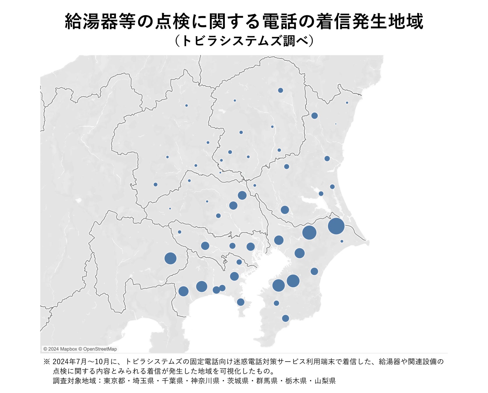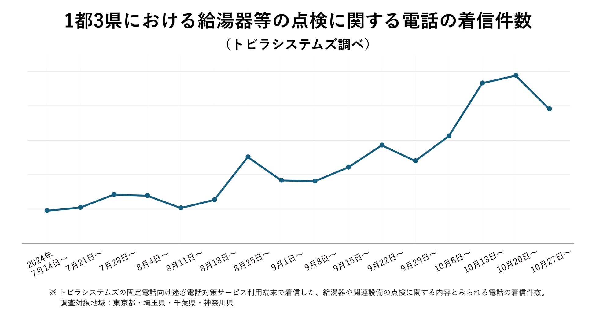 トビラシステムズの調査では、一連の強盗事件が発生した東京都・埼玉県・千葉県・神奈川県の1都3県で、今年8月下旬から10月下旬にかけて給湯器や関連設備の点検に関する電話の着信件数が増加しました。
