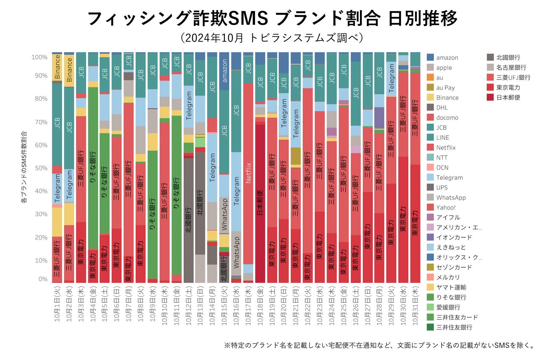 2024年10月は「三菱UFJ銀行」「りそな銀行」「JCB」などの都市銀行やクレジットカード会社をかたるSMSが多発しました。
