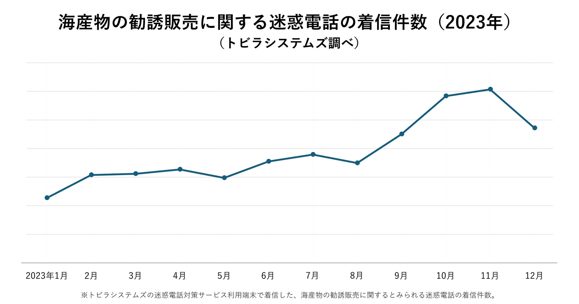 トビラシステムズの調査では、2023年は海産物販売に関する迷惑電話が年末にかけて増加しました。