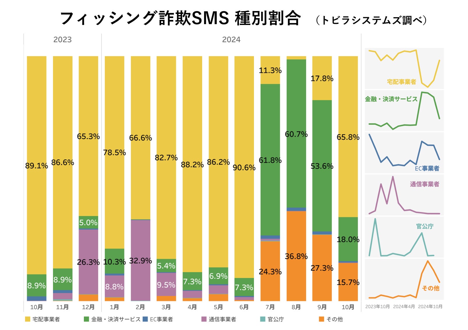 トビラシステムズの調査で、2024年10月に確認されたフィッシング詐欺のSMSの種別割合は、今年7月以降減少傾向にあった宅配事業者をかたる手口が再び急増し65.8%となりました。次いで金融・決済サービスをかたる手口が18.0%、電力会社などのその他の事業者をかたる手口が15.7%となりました。