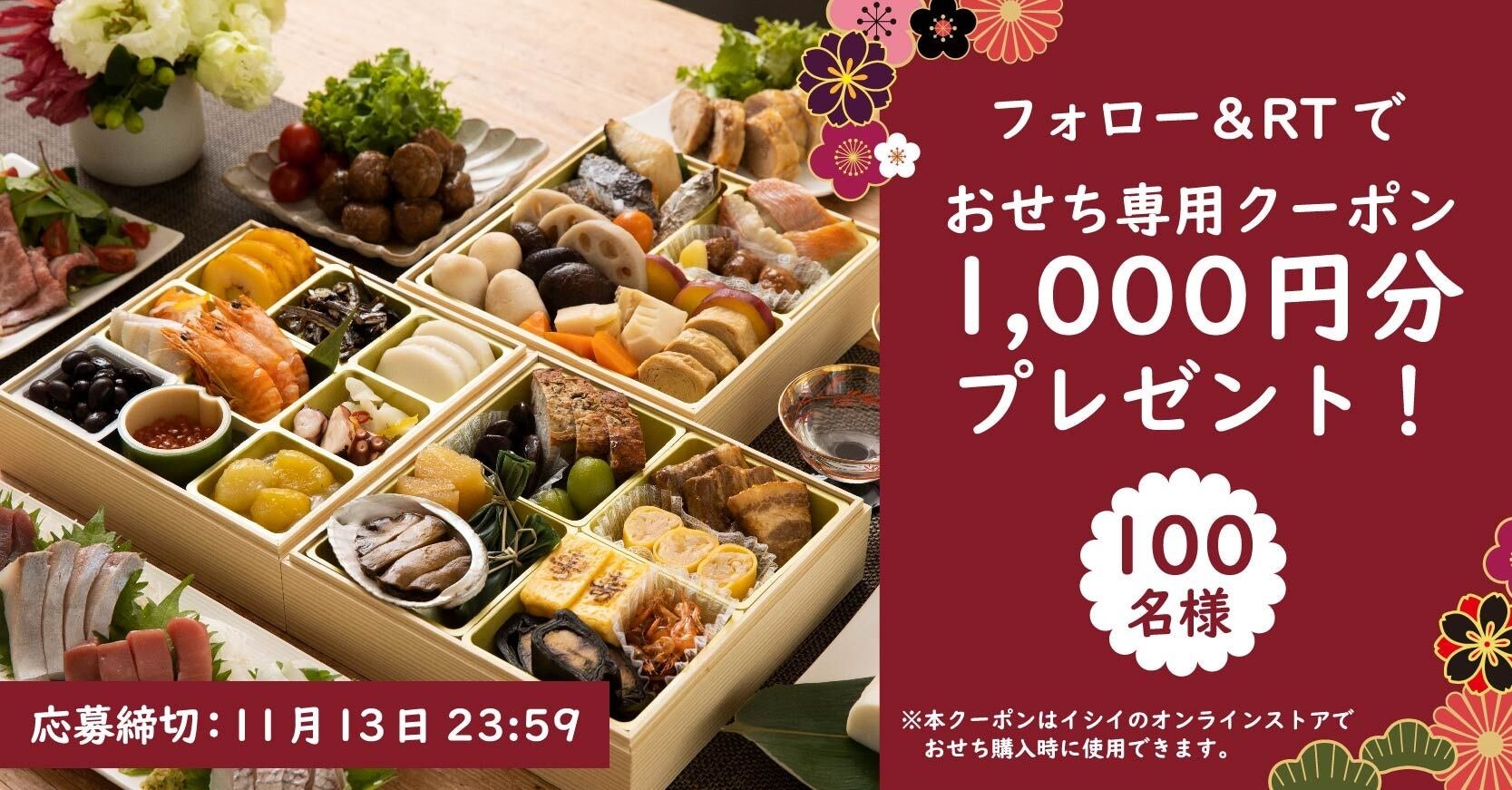 抽選で 100 名様に、石井食品公式 無添加調理専門店「イシイのオンラインストア」での購入の際、対象 のおせち料理に使用できる『おせち 1,000 円クーポン券』をプレゼントいたします。