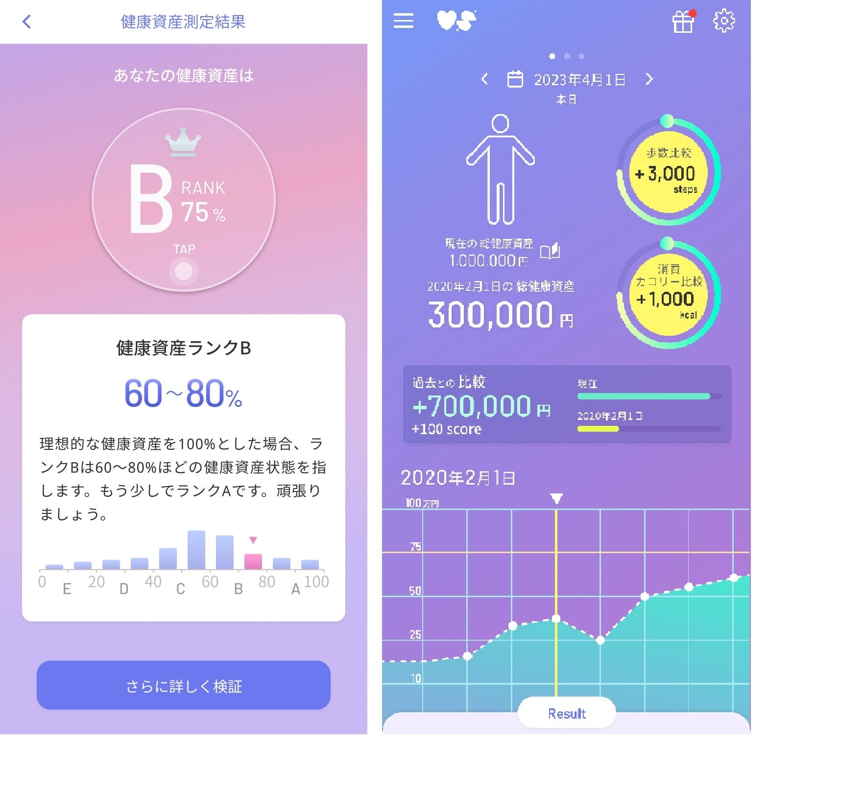 MILIZEは、「健康であることは資産である」と考え、いつまでも健康でい続けられるような意識づけを行なうため、その時点での健康資産額を推計して可視化し、健康につながる行動変容を促すためのAI健康可視化ツール「健康資産」を開発しました。