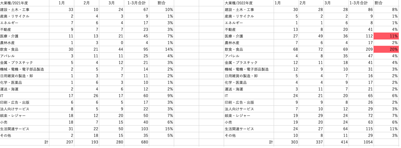(バトンズ 2021年1〜3月と2022年1〜3月の業種別登録案件の月別推移比較表)