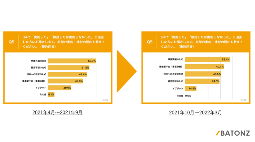 新型コロナウィルス感染症の拡大による「不況」一色だった小規模M&Aの世界でも、2022年に入ってポストコロナというべき傾向が顕著になってきた。2021年第一四半期(1月~3月)でバトンズに登録した譲渡希望事業者は680者であったのに対し、2022年同四半期では1054者と1.5倍以上に増加している。しかし、その理由を分析すると、明確な変化を見て取ることができる。特に目に付くのが、2021年に主流だった経営不振の割合が51.6%から43.6%に大きく減少していることである。