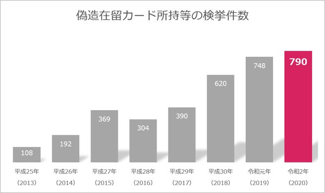 巧妙な作りで本物と見分けるのが難しくなってきている偽造在留カードが横行しており、2020年4月に警視庁が発表した「令和元年における組織犯罪の情勢」によると、2020年の偽造在留カードの所持等の検挙件数は790件と5年間で2倍以上の数値となっており、年々増加傾向にあります。