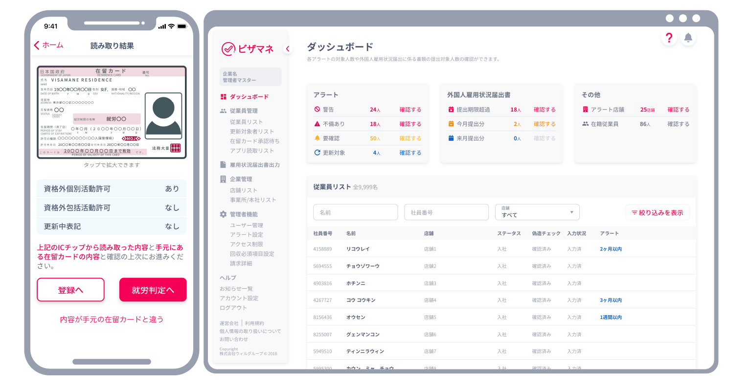 「ビザマネ」は、複雑な外国人労務管理を専門知識のない方でも『より簡単に、より安心に』行うための労務管理クラウドサービスです。在留カードの偽造チェックから、データ・在留期限管理を一気通貫で行えるサービスで、外国人雇用の入社から退職まで労務管理サポートをすることができます。