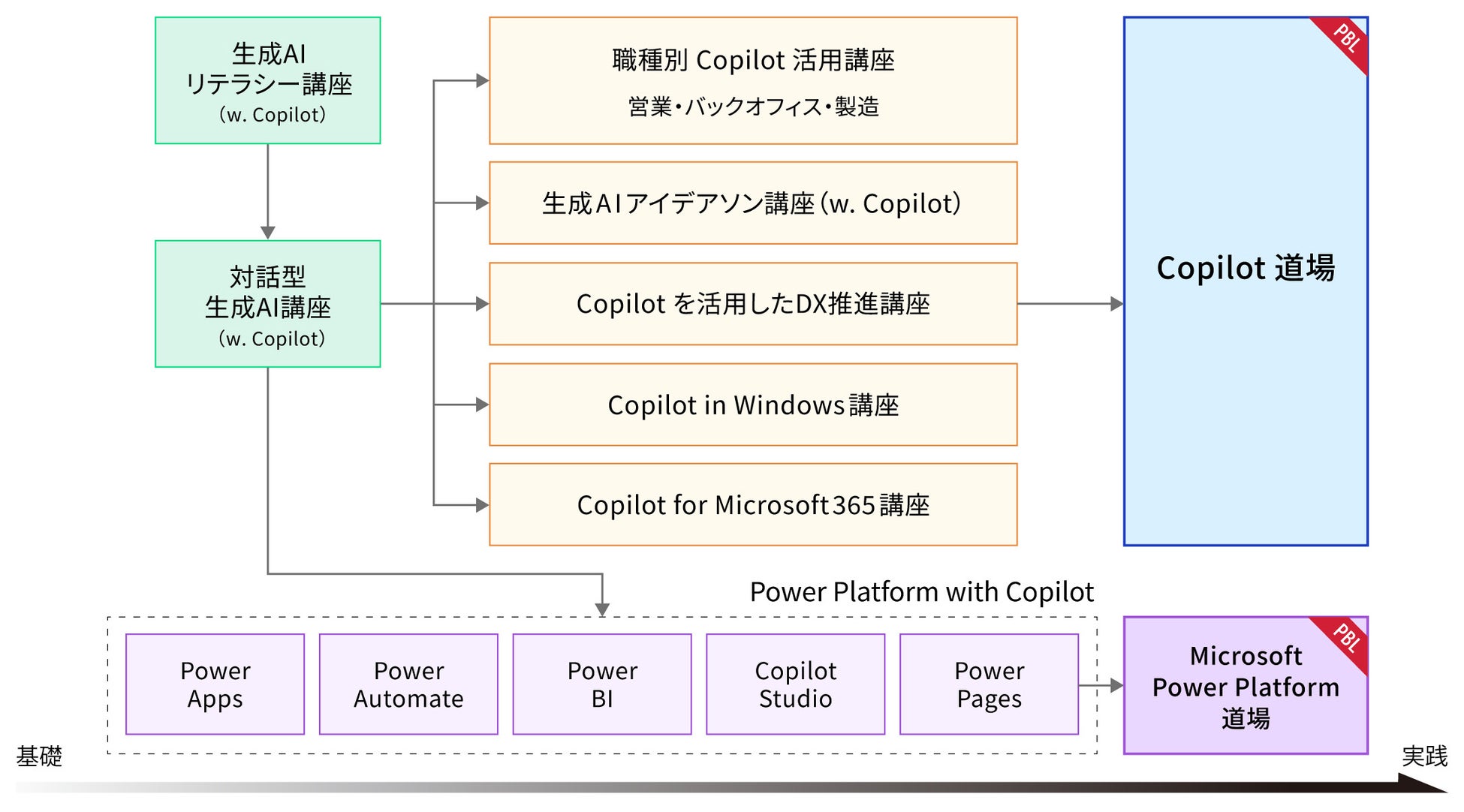 Microsoft Copilotだけでなく、PowerAutomateやMicrosoft Copilot Studioなどのツールの特徴や使い分けについても学ぶことによって、より高度な業務効率化を実現し、組織全体のDX推進に貢献できる人材を育成できます。