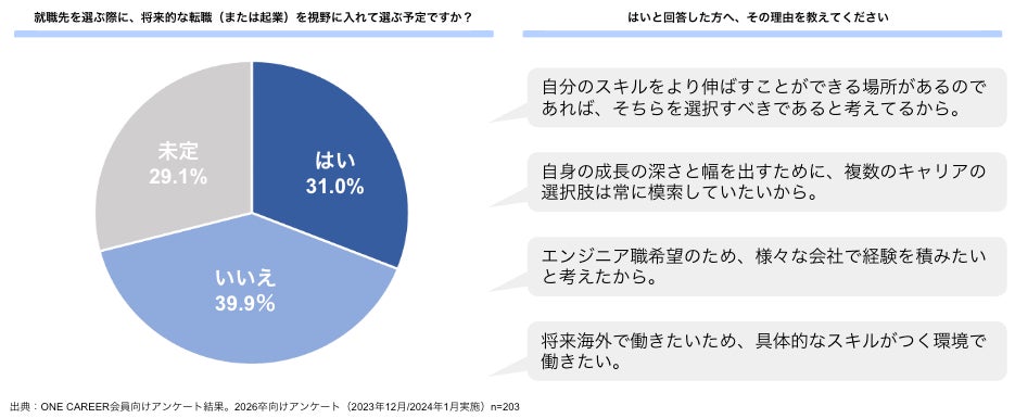 「将来的な転職を視野に入れて就職先を選ぶか」という質問に対しては、「はい」という回答が31.0%を占め、全体の約3割にとどまりました。「はい」と回答した学生に理由を尋ねたところ、「自分のスキルをより伸ばすことができる場所があるのであれば、そちらを選択すべきであると考える」や「自分の成長の深さと幅を出すために、複数のキャリアの選択肢は常に模索していたい」といった声がありました。会社にキャリアを委ねるのではなく、理想のキャリアを実現するための手段として会社を捉えていることがうかがえます。