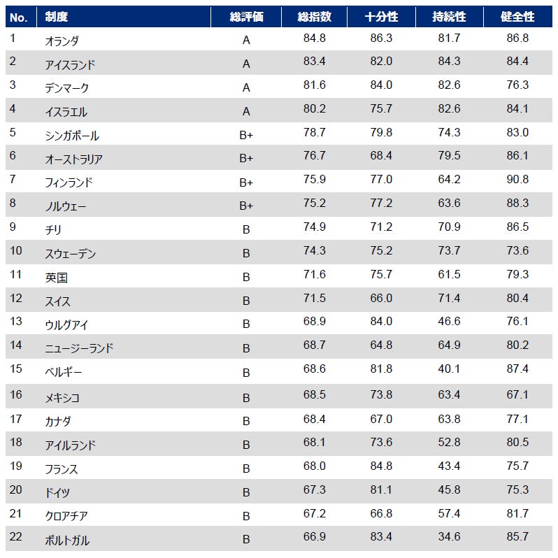 総合指数が最も高かったのはオランダ(84.8)で、アイスランド(83.4)、デンマーク(81.6)が僅差で続いた。オランダの年金制度は、DB方式からより個別的なDC方式へと移行しており、引き続き最良の制度として評価された。この制度はまた、強固な規制を特徴としており、加入者に対し年金に関するガイダンスを提供している。