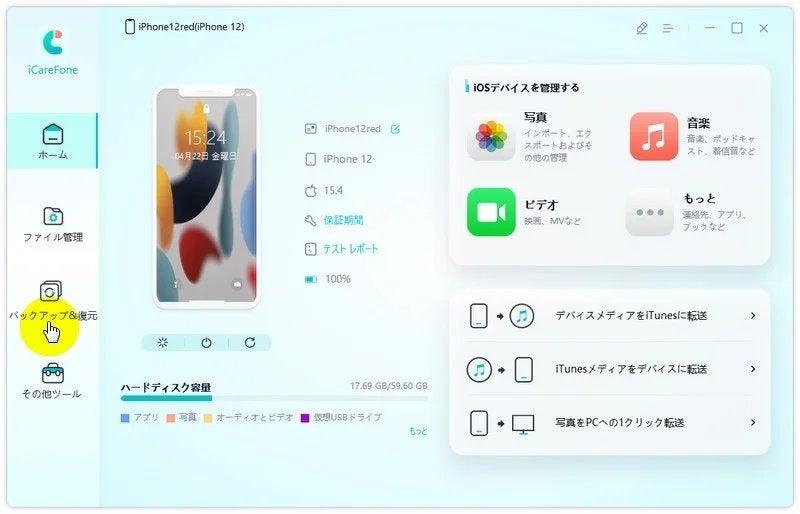 2、iCareFoneで容量を気にせずにバックアップを作成する【無料】