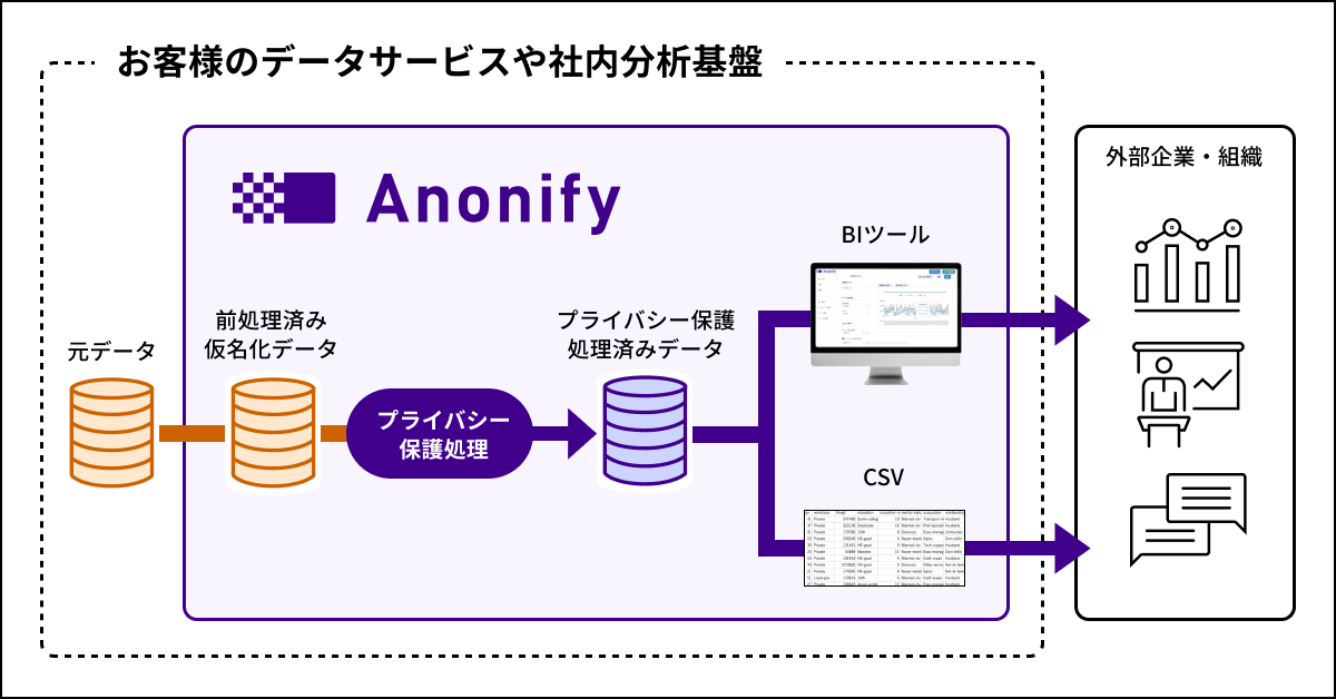 具体的には、プライバシー保護したデータを継続的・効率的に外部提供することが可能な、Anonifyを組み込んだデータ加工・抽出基盤を提供します。