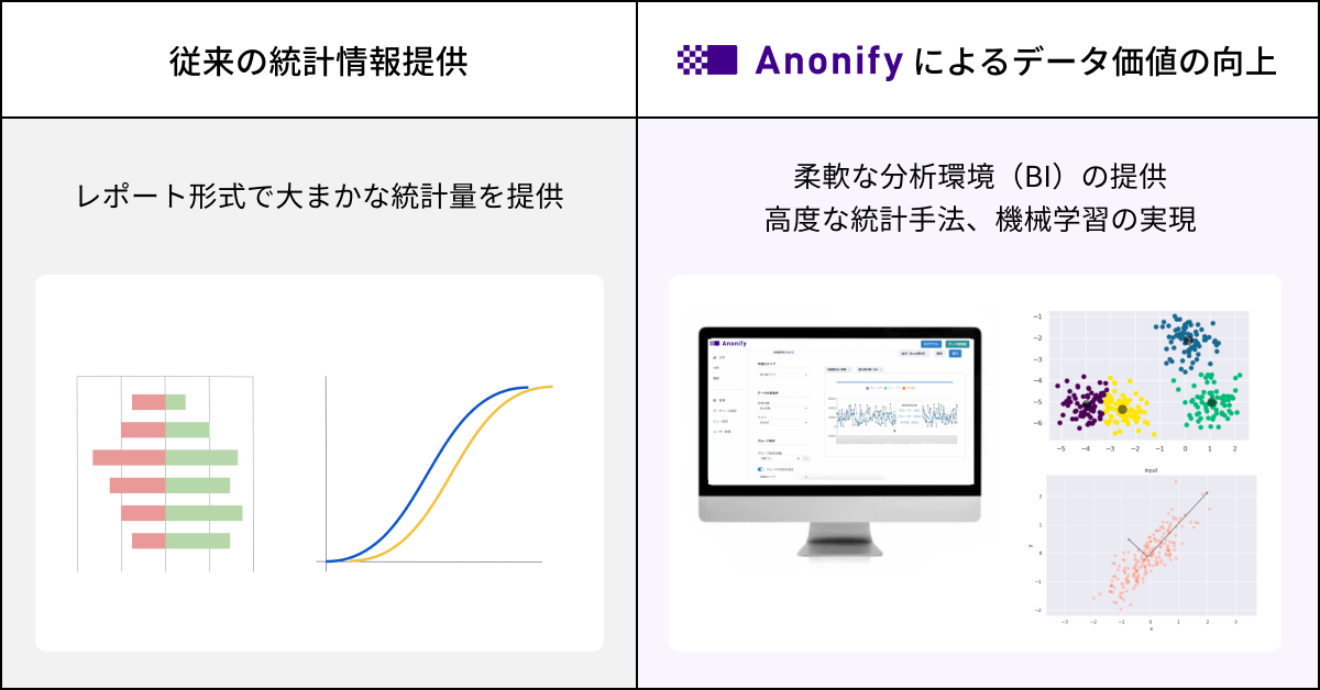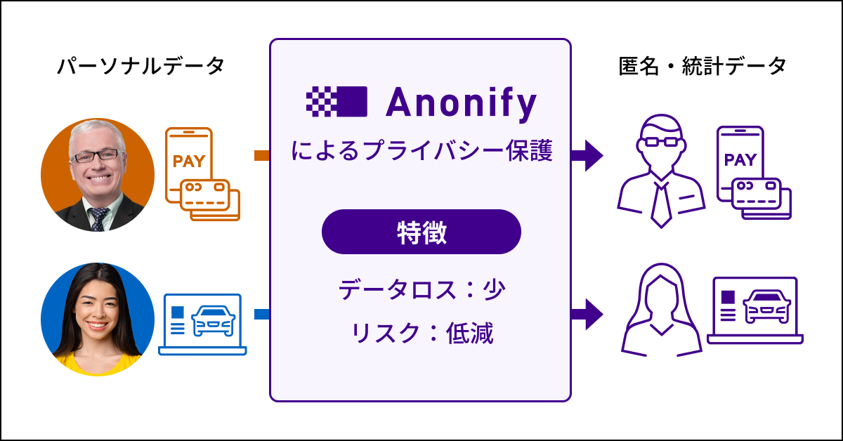 この点、Anonifyでは学術研究に基づいた、客観的・定量的なプライバシー保護手法により、リスクを最小化した上でデータロスを最低限にとどめ、これまで組織内に眠っていたデータの活用や外部への流通などが可能になります。