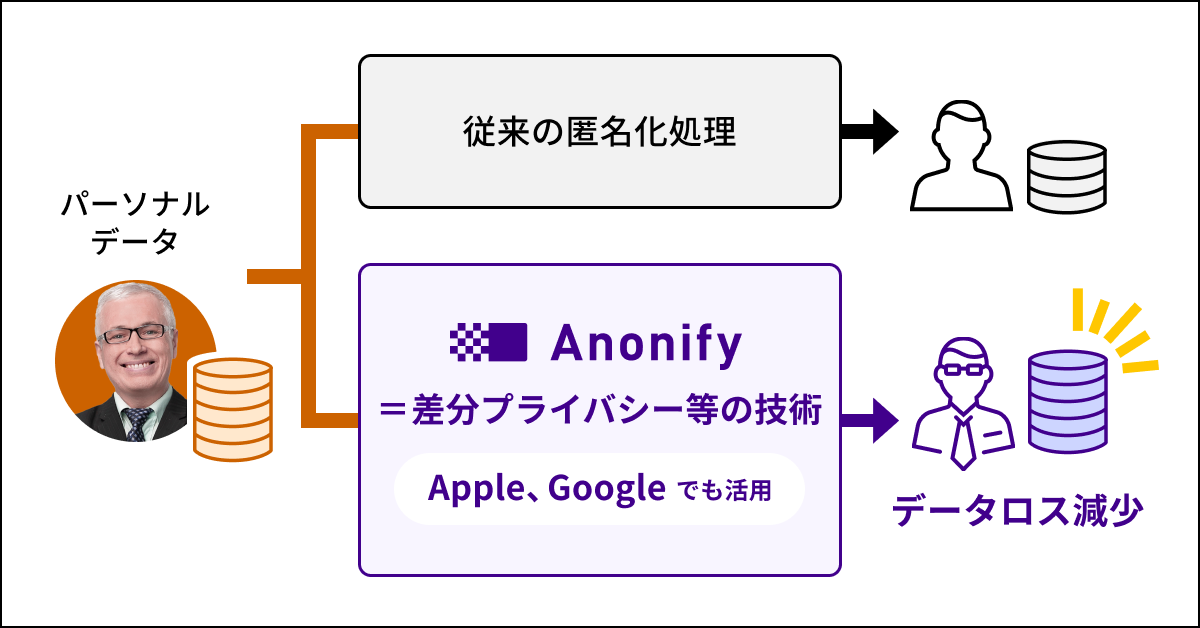 あるいは理論的な裏付けのない方法や手作業でプライバシー保護のための加工を行っており、個人の識別や特定などが発生するリスクが残っていたりと、消費者の不安感につながっていました。