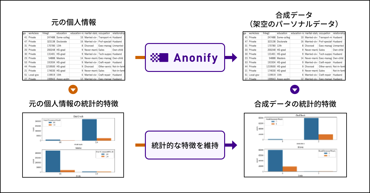 また、元のパーソナルデータの統計的な特徴を維持した架空のパーソナルデータである「合成データ」を生成することも可能です。