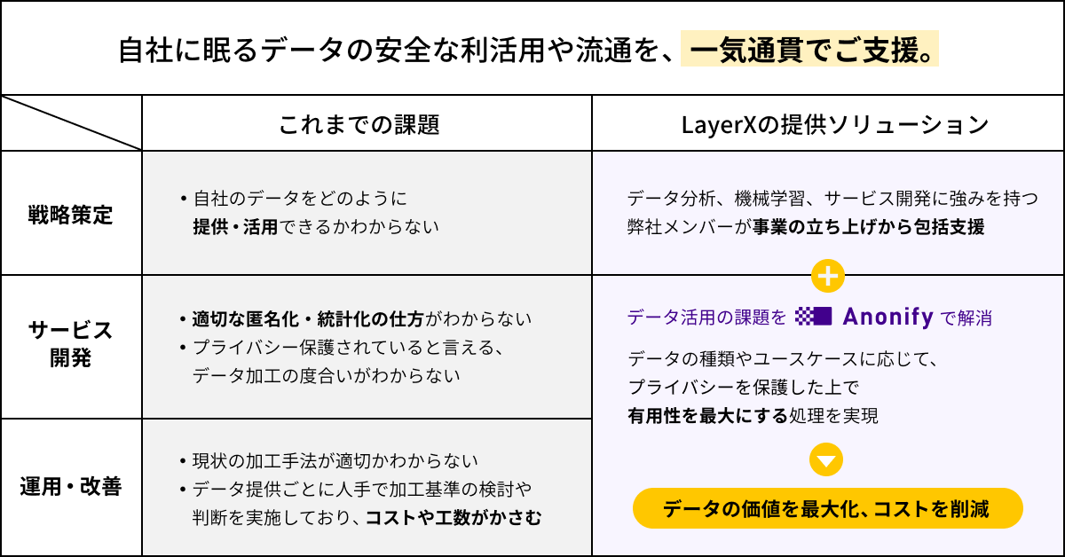 このたびLayerXでは、企業や行政、学術機関向けに、Anonifyを用いてパーソナルデータの活用・流通を支援するソリューションの正式提供を開始します。
