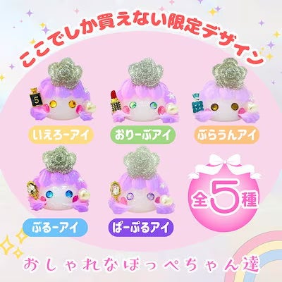 「カラコンほっぺちゃん」は「ここでしか買えない」限定デザインのほっぺちゃんです。5色のおしゃれなカラコンをつけて、コスメグッズを手にしたキュートなデザインとなっています。