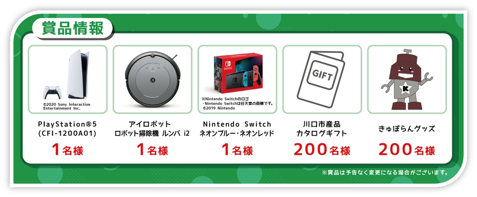 宝を見つけて報告をすると豪華賞品が当たる抽選に参加することができます。川口市の特産品が選べるギフトカタログのほか、豪華な賞品ラインナップ。皆様のご応募お待ちしております。