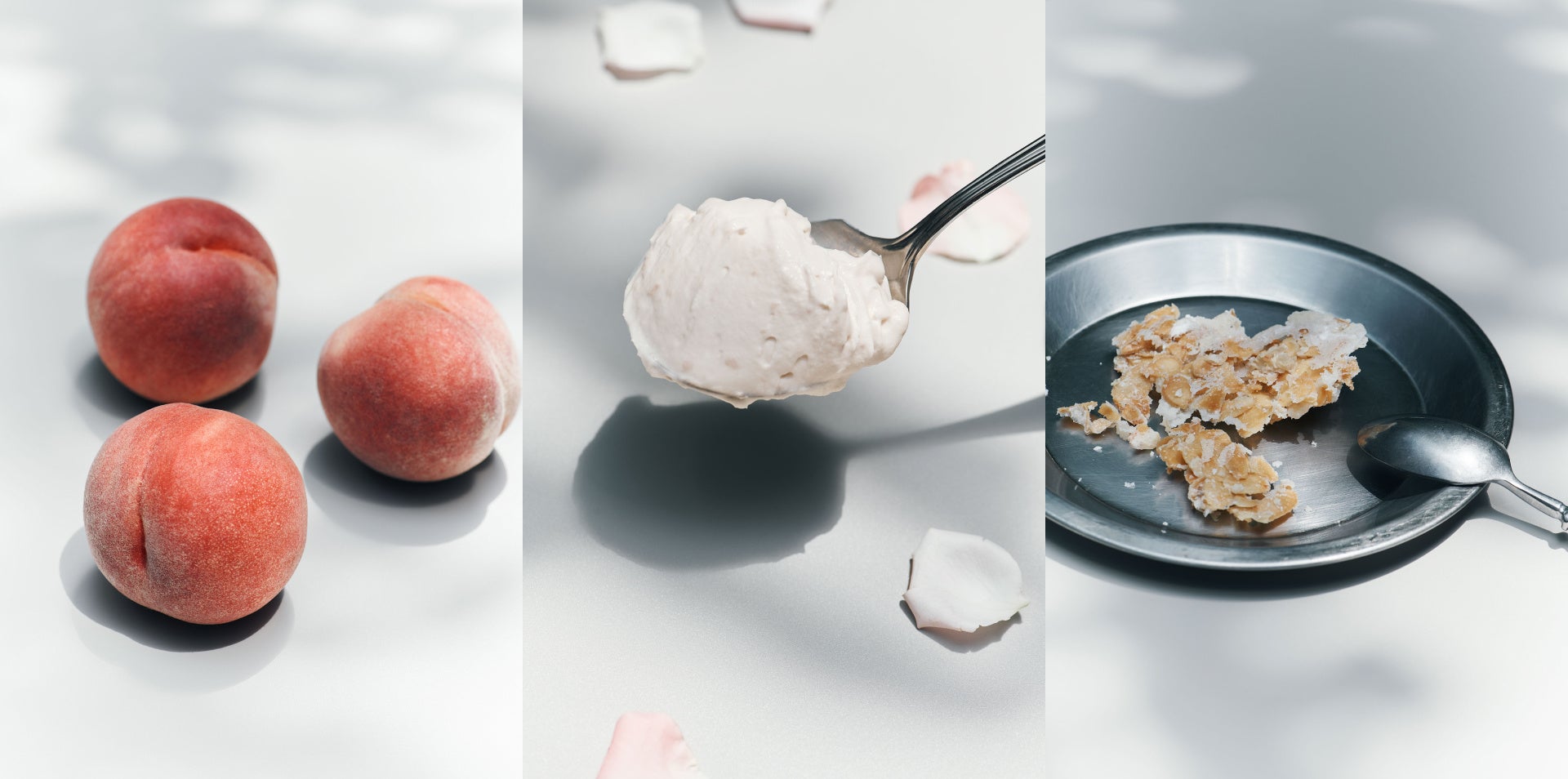 完熟桃ソース / 薔薇ホイップ / 桃のコンポート / アーモンドミルク / ラズベリーチュイル