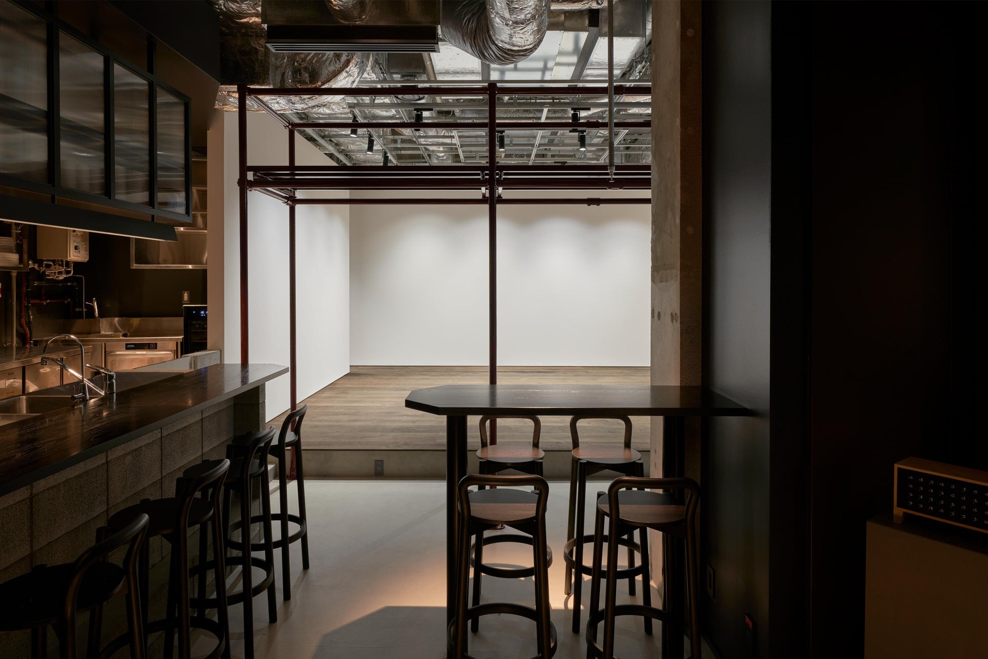 アート作品と向き合う緊張感と、仲間たちとの食事でリラックスするひと時。26坪という決して広くはないスペースを2つに分断し、それによって生まれるオモテとウラをシームレスに味わえる場を目指しました。