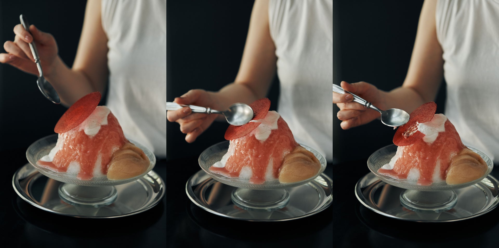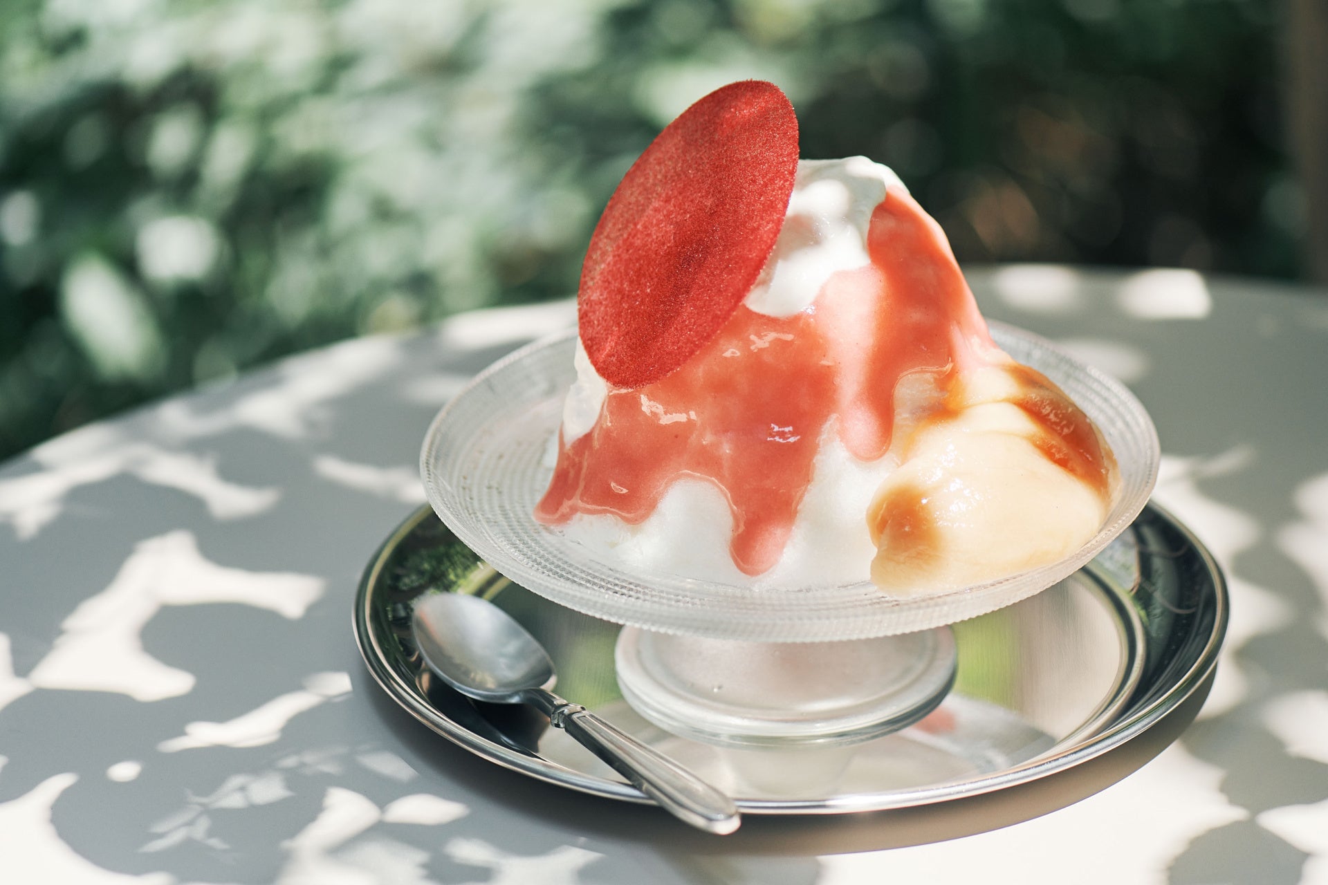 フレンチシェフが考案、ギャラリーの裏で「かき氷」。8月の新メニューは桃を使った「ピーチ・メルバの氷」