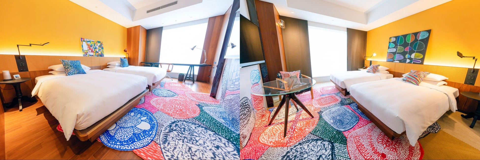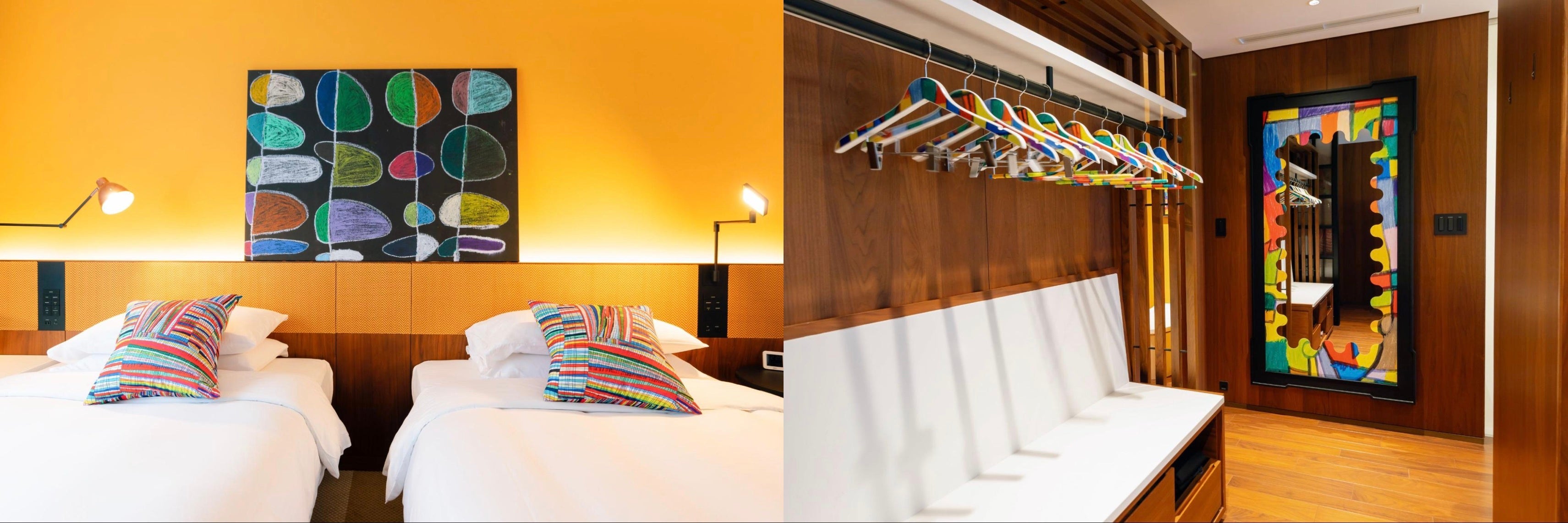 知的障害のあるアーティストが生み出す、異彩を放つアートの力で、訪れるゲストの方々の感性を刺激し、新たな視界や価値観が生み出される宿泊体験を通じて、豊かな気持ちを味わっていただけるようなコンセプトルームをスタンダード、スイートの各タイプで両社が手掛け、乃村工藝社に空間デザイン・施工協力いただきました。期間中、各室一日一組限定でご宿泊いただける特別な客室で、異彩を放つアートをさまざまな素材・手法で取り入れ、「ヘラルボニー」の世界観を楽しめるインテリアに加え、空間全体を鮮やかに彩ります。